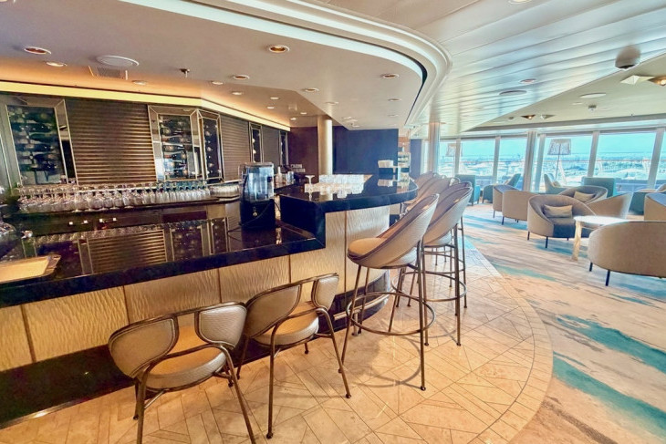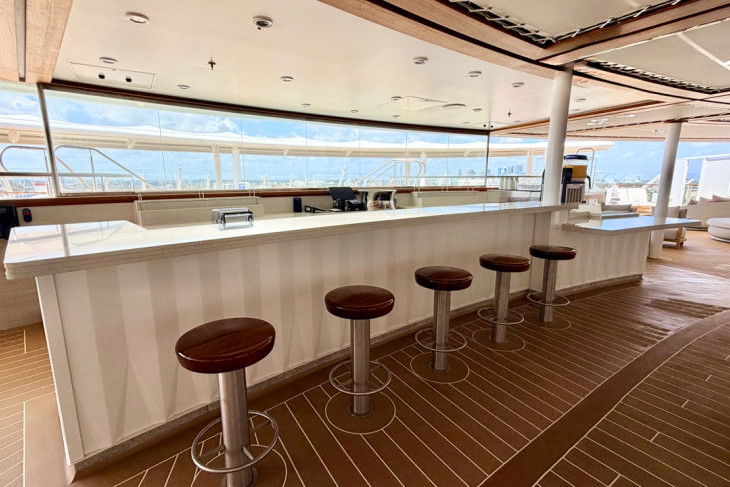 A white marble entry hall features a spiral staircase to the bedrooms upstairs and draws the eye to the floor-to-ceiling windows on both levels overlooking the ship and pool below. Marble flooring continues into the downstairs living area, where chocolate-brown, rich-red tones and gold accents abound. There is a bar with barstools, a dining table seating eight, a sofa, easy chairs, and a large TV that pops up from a console, all overlooking those massive windows that can easily become private with a flip of the switch. Off the living area, on one side, is a service kitchen, and on the other, a study that converts into an additional en-suite bedroom when the queen Murphy bed is down.