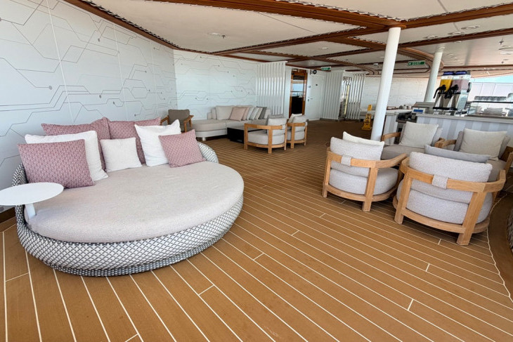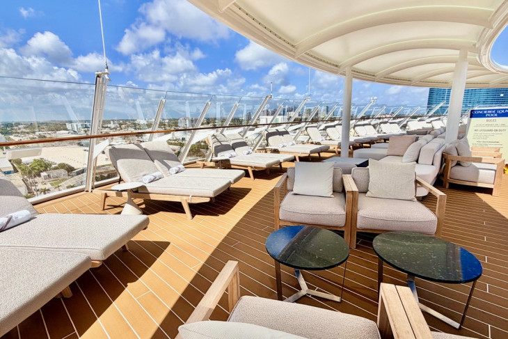 Category 2A, Concierge One-bedroom Suite with Extended Verandah. These one-bedroom suites feature a sizeable balcony. One king bed, a living area with a double convertible sofa, and a single wall pull-down bed. Located on Deck 12, sleeping five with 1,031 square feet, including the extended verandah.