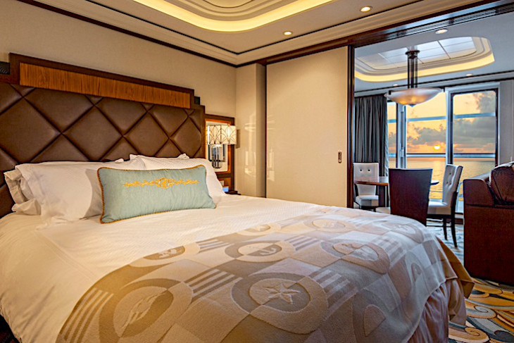 Shiny teak hallways, a dreamy palette of sea blue and chocolate brown, elegant furnishings, deep balconies. This is what concierge guests, located on Deck 11 and 12, have to look forward to on their Disney Dream or Disney Fantasy cruise. Those ensconced in the ship’s twenty-one suites will also enjoy your choice of pillows as well as TVs integrated into bathroom mirrors. All suites come with two baths with the master featuring a giant-size whirlpool tub, rain shower, double sinks, and separate toilet area. Closets are walk-in, living areas feature a Blue-ray DVD player, and both the living and the master have a 42” HDTV. Balconies in all concierge staterooms and suites are deeper than standard staterooms, and some balconies in the largest suites are gigantic, wrapping the front of the ship.