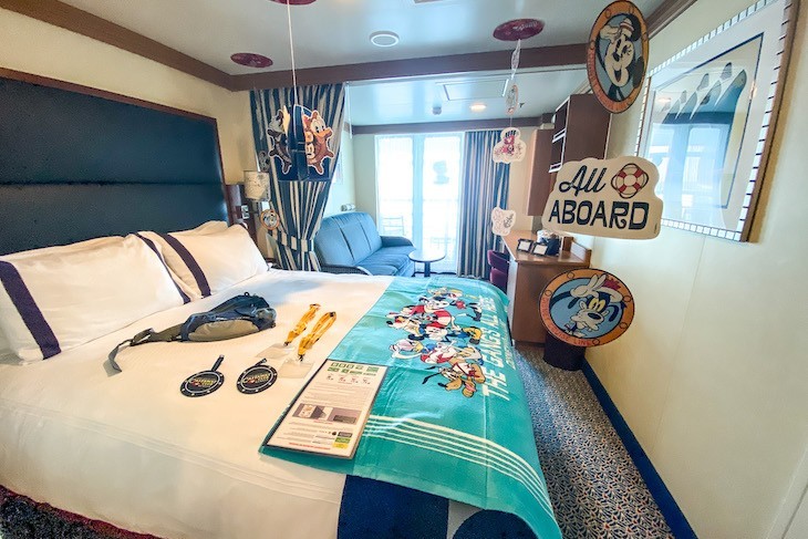 Category V Concierge Family Oceanview Stateroom with Verandah. Much like the non-concierge, Category 4 stateroom, but with upgraded décor and a deeper balcony, these accommodations offer a queen bed, mocha-colored chenille double sleeper sofa (realize that when the sofa is open you won’t be able to access the balcony without stepping over it), double sleeper sofa and upper berth pull-down bed in the living area, and a split bath featuring a round tub/shower. Located on Decks 11 and 12 sleeping five in 306 square feet, including the verandah.