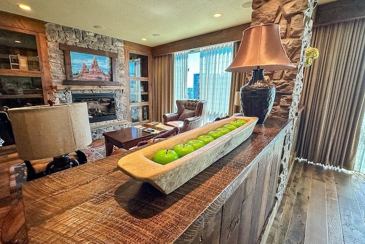 The Old West is alive and kicking at the Big Thunder Suite. This two-bedroom beauty has a doorbell that rings like the howl of a wolf, a foyer with sounds effects from a runaway mine train, stone columns, repurposed barn wood flooring and paneling, and Navaho-style rugs. A mixture of rustic and luxury is on display in the suite’s living area with a stone gas fireplace centerpiece with hidden TV above. A leather sleeper sofa and two oversized chairs mix with antique mining tool accessories. The six-person dining table is lit by a wagon wheel chandelier, and a nearby is the wet bar adorned in copper over which hangs a “magical” gold miner photo. A half bath is found off the living area with a copper bucket sink, lantern light fixtures, and pull-chain commode. There’s no balcony, but lovely views of the resort pools are seen from the oversized windows.