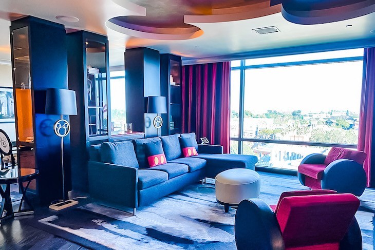 Guests with concierge-level service have access to the High Note Club located on the 11th floor of the Adventure Tower. From this lovely vantage point are spectacular vistas of the entire Disneyland Resort, including a view of all five “mountains” in both parks. And better yet, it’s a picture-perfect location for watching the fireworks show, complete with music. Totally renovated in 2025, this club-level lounge celebrates the music and sounds of Disneyland Park circa 1955, nearly doubling the space of the previous E-Ticket