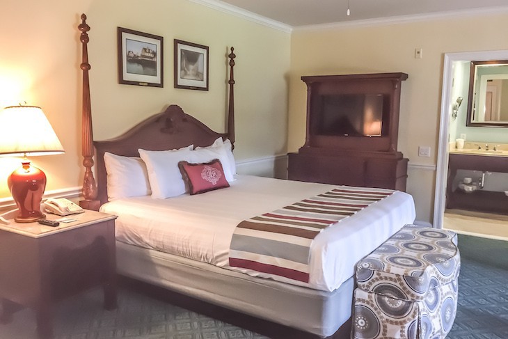 Newly renovated in 2024, these Victorian-style accommodations average 434 square feet, all with French doors leading to full-size balconies or patios. Sea-green and buttercup yellow plaid fabric headboards decorate either a king or two queen beds made with white sheeting. A white bureau over which is a large TV, and prints of a turn-of-the-century boardwalk adorn the walls. A sea-green-colored, flip-over single sofa sleeper with bolster accent pillows, soft yellow wall paint, and plank-style hardwood flooring completes the look.