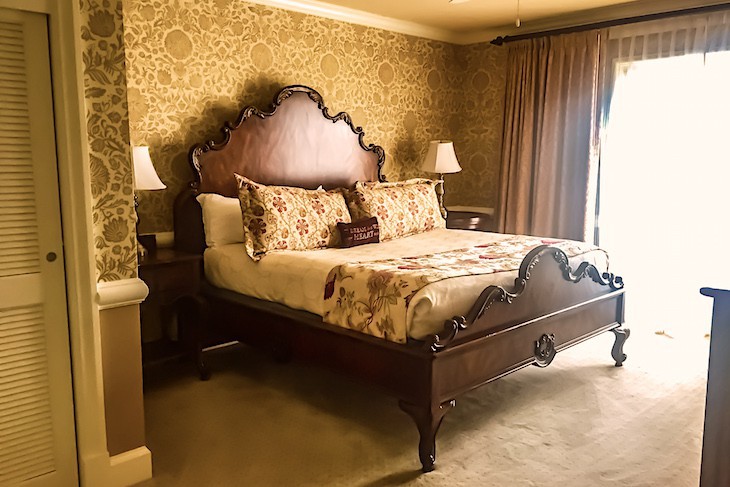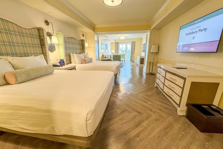 Four 2-bedroom Suites, all located on the 4th floor, come with 1,288 square feet, hardwood flooring, and area rugs throughout. A small parlor, decorated in cream, buttercup yellow, and plum, is furnished with a queen sleeper sofa, coffee table, occasional chair, bureau, flat-screen TV, and dining table for four. There’s also a wet bar with a sink, microwave, undercounter refrigerator, and Nespresso coffee maker. A half bath is off the foyer. The primary bedroom offers a king bed, easy chair with an ottoman, and bureau with a flat-screen TV. Leading into the master bath is an open area with a makeup vanity desk with a wonderful backlit mirror and an armoire-style closet. The primary bathroom features white mosaic floor tiling, an oversized, freestanding, non-whirlpool tub, separate commode area, marble shower, and double sinks in a taupe granite countertop. Opposite the living area is a standard guest room with upgraded decor, two queen beds, and its own entrance. Balconies extend the length of the suite, and all have a view of the gardens. Suite number 4205 has a bonus of an Epcot fireworks view but loses points with its view of a slice of the road. View Disney’s Boardwalk Inn Two-bedroom Suite on the Glass Slipper Concierge YouTube channel.