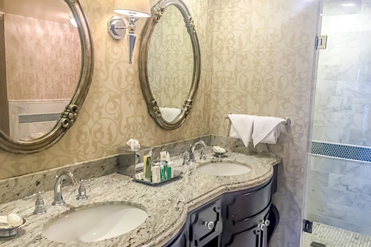 As well as standard-size rooms, the concierge level has ten very spacious, 644-square-foot Deluxe Rooms, all with a spectacular view of Disney’s BoardWalk and Crescent Lake, and even a view of the Magic Kingdom® fireworks in the far distance. They come with two queen beds, a bureau over which is a flat-screen TV, an open seating area outfitted with a queen-size sleeper sofa, coffee table, two easy chairs, and additional bureau and TV. The bath is a standard size, and the water-view balcony overlooks the boardwalk. Five Deluxe Rooms are on the 3rd floor and the other five on the 4th floor, but you will find a stairwell nearby for easy access to the concierge lounge for 3rd-floor guests. Two adjoining, room numbers 3227 and 3229, perfect for families (on request only). Tour Disney’s Boardwalk Inn Deluxe Room on the Glass Slipper Concierge YouTube channel.