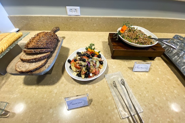 In the lounge is the same menu as the next-door Beach Club with complimentary food and beverages on offer throughout the day. Mornings bring coffee with a self-service Nespresso machine, juices, fresh fruit, cereal, muffins, orange loaf with oat streusel or apple-cinnamon loaf, croissants, warm cinnamon buns with cream cheese frosting, bagels, toast, steel-cut oatmeal, cheese grits, rotating egg dishes such as a seasonal egg casserole or egg white frittata, silver dollar pancakes, crepes, slow roasted ham, chicken sausage (plant-based sausage by request), a variety of yogurt including Greek with homemade granola, and hard-boiled eggs. Midday Seaside Snacks consist of fruit, crudites, candies, bagged snacks and chips, muffins, sweet loaf bread, oatmeal-raisin, sugar, and chocolate chip cookies, lemonade, and iced tea.