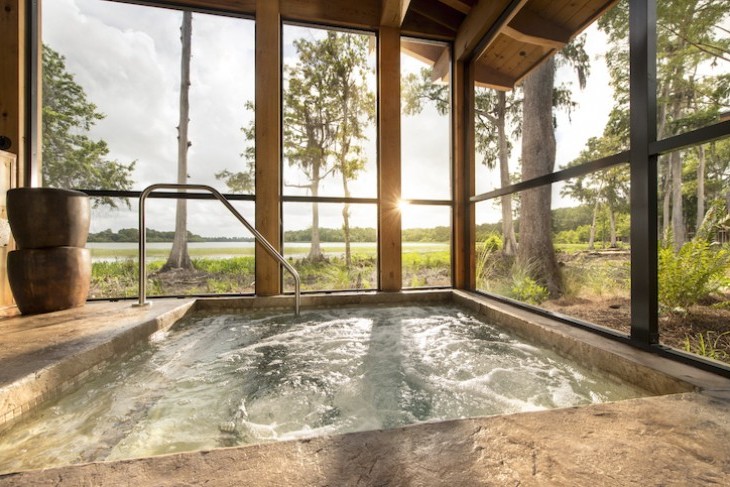 Gorgeous native landscaping surrounds each cabin sleeping eight in a king bed, queen bed, fold-out bed, queen-size sleeper sofa, and sleeper chair (wood flooring throughout). On entry are the two bedrooms across the hall from each other, each with en-suite baths.