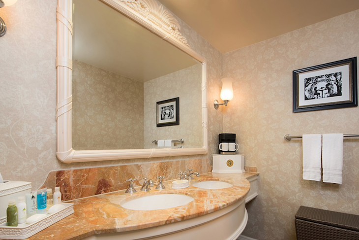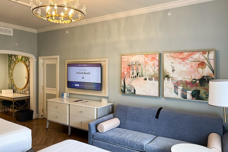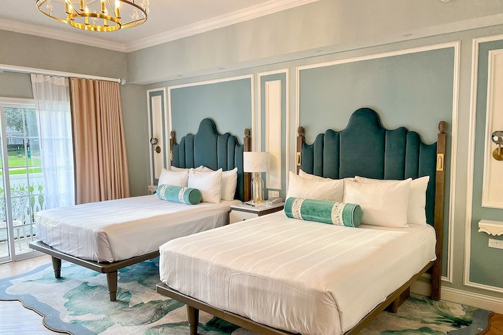Grand Floridian guest rooms offer 440 square feet in Walt Disney World’s flagship resort. Newly renovated rooms come with a subtle Mary Poppins theme in cheerful shades of blue, green, and white. Each offers either one king or two queen elevated beds offering storage space underneath and a lilac-tinted single sleeper sofa with soft peach bolster pillows. Beds outfitted with cerulean blue headboards, white sheeting, and turquoise velvet bolster pillows. Bureau and bedside table are solid white and in the entry hall is a large vanity/desk with velvet seating. Large flat-screen TVs and under-counter refrigerators are additional amenities. A sliding barn-style door separates the bath, now outfitted with a sparkling white double-sink vanity, antique gold fixtures, plenty of great lighting including a backlit vanity mirror, make-up mirrors, and a separate toilet/shower area. The closet contains an electronic safe, clothes steamer, full-length mirror, and robes. All rooms have Keurig coffeemaker and nightly turndown service.