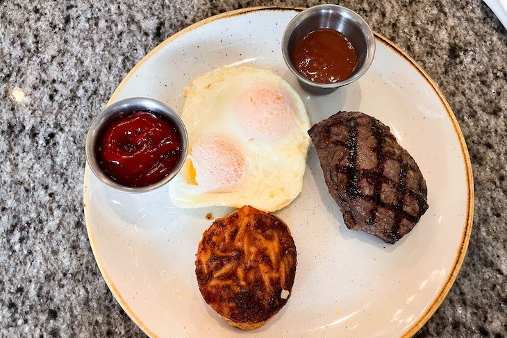 Steak and Eggs - Sirloin Steak, Cheesy Hash Brown Casserole, Two Eggs, and House-made Steak Sauce 21